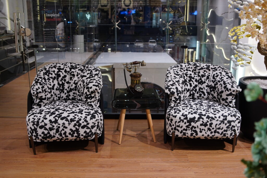 The focal points are a pair of identical, small club-style armchairs upholstered in a striking black and white print resembling cowhide or a Dalmatian spot pattern. The chairs have rounded backs, low profiles, and sit on slim, dark legs, providing a bold visual statement.Separating the two chairs is a small, contemporary side table with a black glass top and three angled light wood/natural finish legs.Resting on the side table is a vintage, antique-style rotary telephone in a dark, ornate finish, adding a sophisticated, old-world touch that contrasts with the modern chairs.