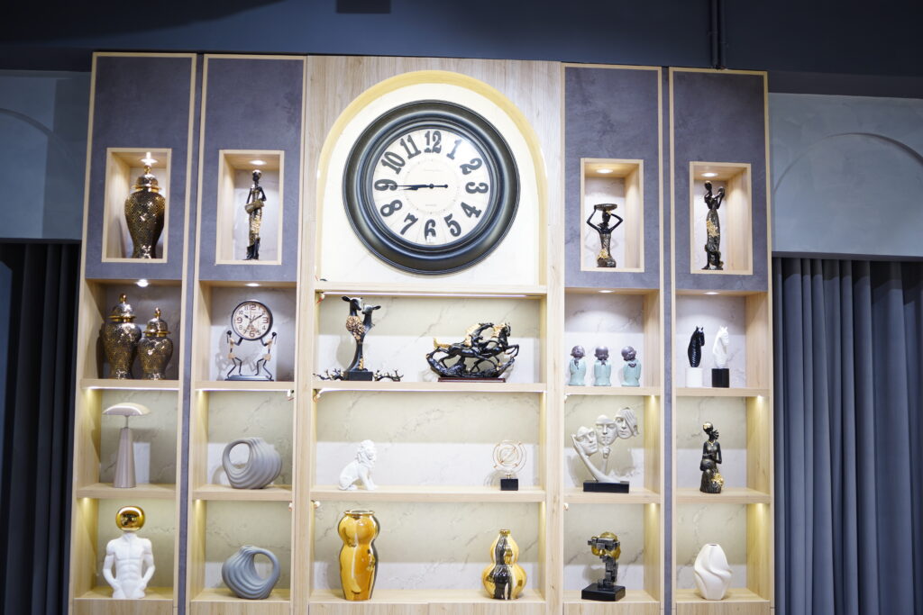 A complex, built-in display shelving unit featuring a symmetrical grid pattern. The central focus is a large, classic wall clock set into an arched alcove with backlighting. The surrounding shelves, with light wood backing and dark borders, are filled with a curated collection of diverse decorative objects, including abstract sculptures, metallic vases, figurative statues, and stylized animal figures. The design effectively uses lighting to highlight the various art pieces.