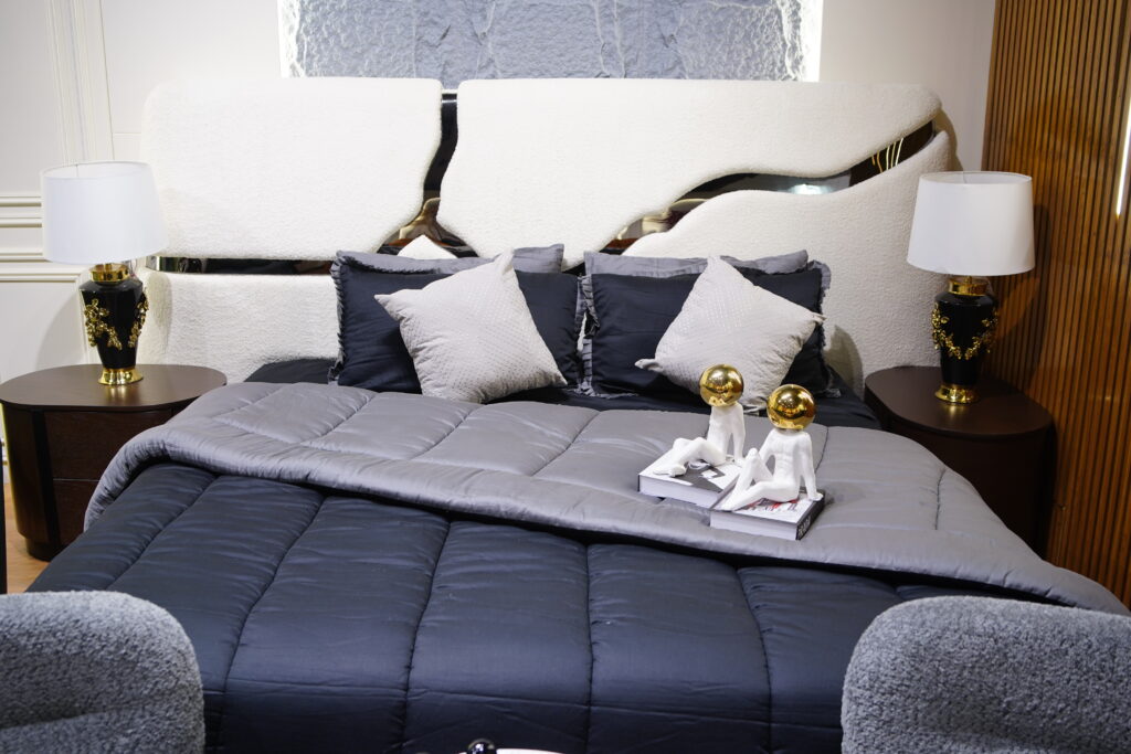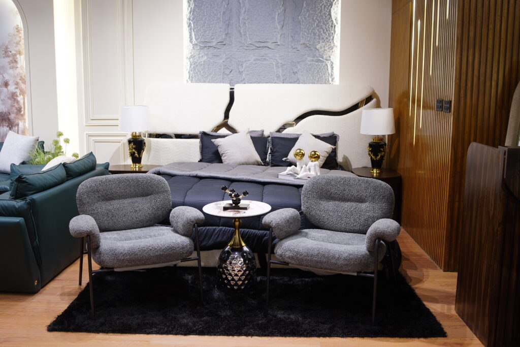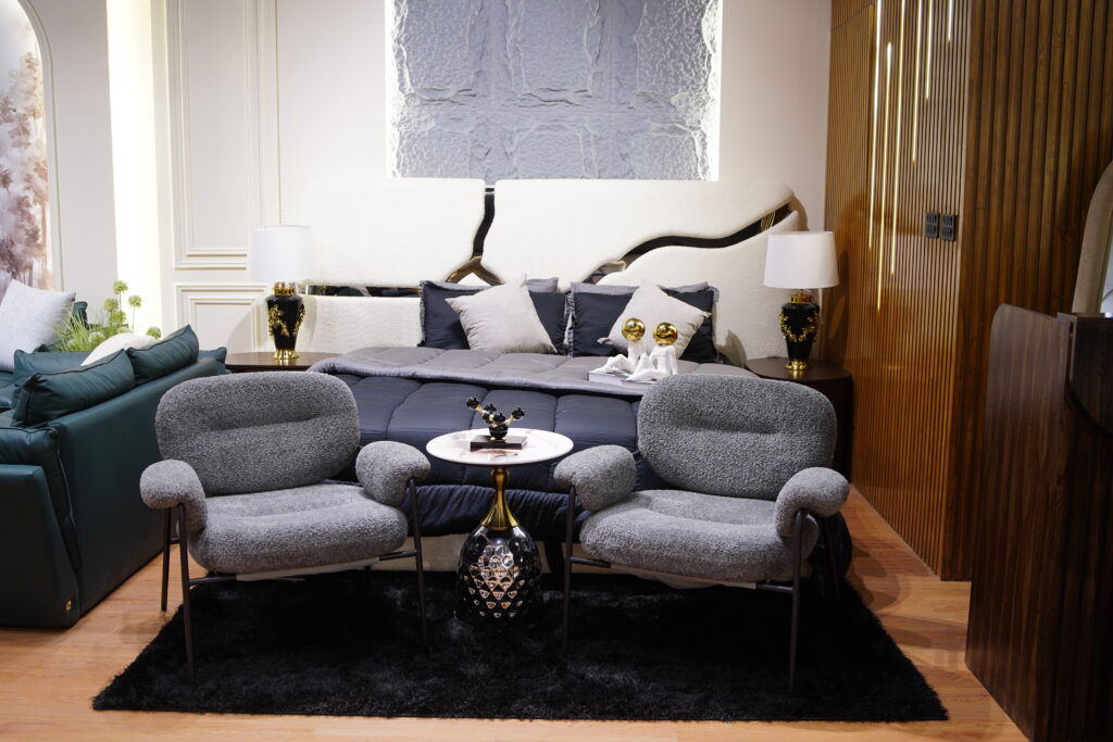 This luxury contemporary bedroom set features a sculptural upholstered bed, modern lounge chairs, and elegant side tables designed to elevate any interior. Rich textures, soft curves, and premium materials come together to create a sophisticated, hotel-inspired bedroom atmosphere. Perfect for homeowners seeking comfort, style, and a refined modern aesthetic.