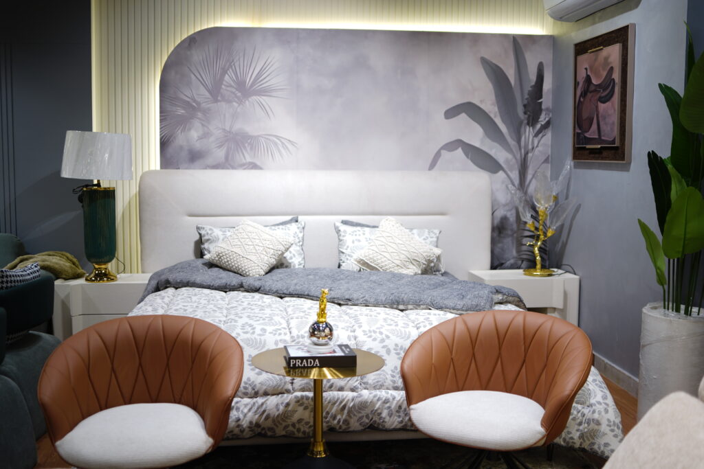 A calm bedroom setting featuring a low-profile bed with a padded, neutral headboard, set against a stunning monochrome botanical wall mural. The mural, with an arched upper corner, is flanked by vertical wall paneling and subtle backlighting. The bed is dressed in a patterned white duvet and a grey throw. The foreground is anchored by two striking, quilted brown leather shell chairs with white seats, sitting opposite a small, round brass side table.